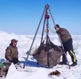 于是考察隊員靈機一動,拿出隨身攜帶的起重三腳架架設在雪地上,再在三腳架下面搭建上一臺冠航手動葫蘆,接著用結實的絲網將北極熊包裹住,再用手拉葫蘆的吊鉤鉤住絲網,順利將它挪動到車輛上。