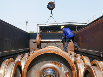 在露天軌道線上??恐噍v鐵皮敞車車廂,而車輪車間的搬運工人則需要將車軸、輪餅和輪對進行卸車作業,他們用來吊運輪對的起重吊裝設備是行車,正式吊運時,由一人負責操控行車,熟練地運作吊鉤,使其上下吊運,而站立在貨車車廂上的司機則負責使用安全鉤和其他的吊索具將一條超過1噸重的輪對穩穩吊起。