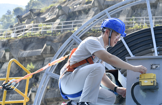 在水電站中,高處設備檢修工作時刻彰顯著重要性。工人佩戴著防墜器和安全帶,這些小小的裝備如同忠誠的衛士,緊緊守護著他們的安全,為防止高空墜落織就了一張堅固的安全網,確保每一次作業都能在安全的軌道上進行。