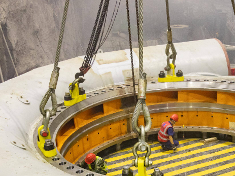 隨著起重設(shè)備的緩緩運(yùn)作,鋼絲繩索具穩(wěn)穩(wěn)地牽引著龐大的蝸殼,按照預(yù)設(shè)路徑精準(zhǔn)移動(dòng)至安裝位置。整個(gè)過程中,索具始終保持穩(wěn)定的受力狀態(tài),憑借其強(qiáng)大的承載能力和可靠的性能,完美配合施工團(tuán)隊(duì)完成了這一關(guān)鍵步驟,為水電站后續(xù)的順利建設(shè)奠定了堅(jiān)實(shí)基礎(chǔ)。